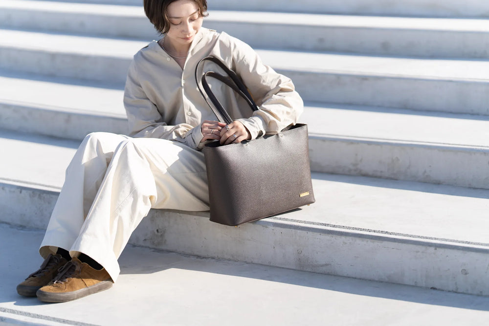 GEN mini[ゲンミニ]|レザービジネスバッグ GENの設計思想を継承した、レザービジネスバッグ。開口が大きく、中身が見渡せて荷物が出し入れしやすい構造です。 基本の形と設計 空の状態でも自立しやすい設計。ファスナー開口は大きく開き、視認性と操作性を高めました。芯材を適所に配し、型崩れを抑えています。 メイン収納と仕切り メイン室は1層構造。A4対応で、ビジネス必需品を整理して収納できます。内装はマイクロファイバー(ブラウン)で、精密機器をやさしく保護します。 ポケットと収納設計 A4書類やPCまわりの小物を、美しく整えて持ち運べる収納設計です。 ポケット構成(計4箇所)・中央仕切りポケット ×1(14インチ対応PC収納/口元レザー仕様)・前面オープンポケット ×2(名刺入れ・スマホ対応サイズ/口元パイピング仕様)・背面ファスナーポケット ×1(クロムレザー縁取り/強度と美観を両立) 開閉と金具 メインはファスナー開閉。引手はつまみやすい形状で、スムーズに操作できます。ファスナーはYKK®を採用。 自立性と底面のつくり 底面にはクッション芯材入り底板を採用。角を落とした楕円形の設計で、どの角度から見ても美しいフォルムを保ちます。 底鋲は5点配置し、接地時の汚れ・摩耗を軽減します。 ハンドル ハンドルはコート着用時でも肩掛けしやすいサイズ感です。 軽さと持ち心地 重量は約 1150 g。PCを中央に収める設計で、重心が安定し、持ち運び時の負担を軽減します。 素材と仕様 表地:クロムレザー 裏地:マイクロファイバー(ブラウン) 機能:撥水性(※完全防水ではありません) 金具、ブランドプレート、YKK®ファスナー:オリエンタルブルー/コーヒービーンズ(ゴールド)、ブラック(ブラック) カラー コーヒービーンズ/オリエンタルブルー/ブラック サイズと重さ 外寸:W 36cm × H 26 cm× D 14 cm ハンドルの高さ:30cm(入れ口からハンドルまで)...